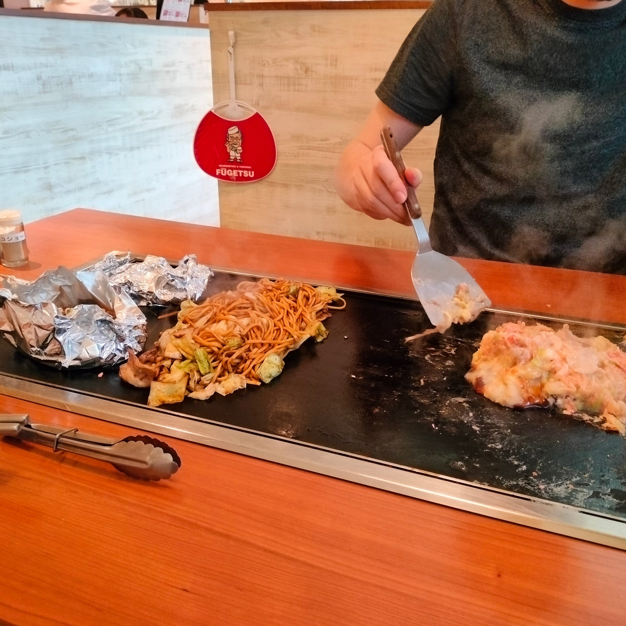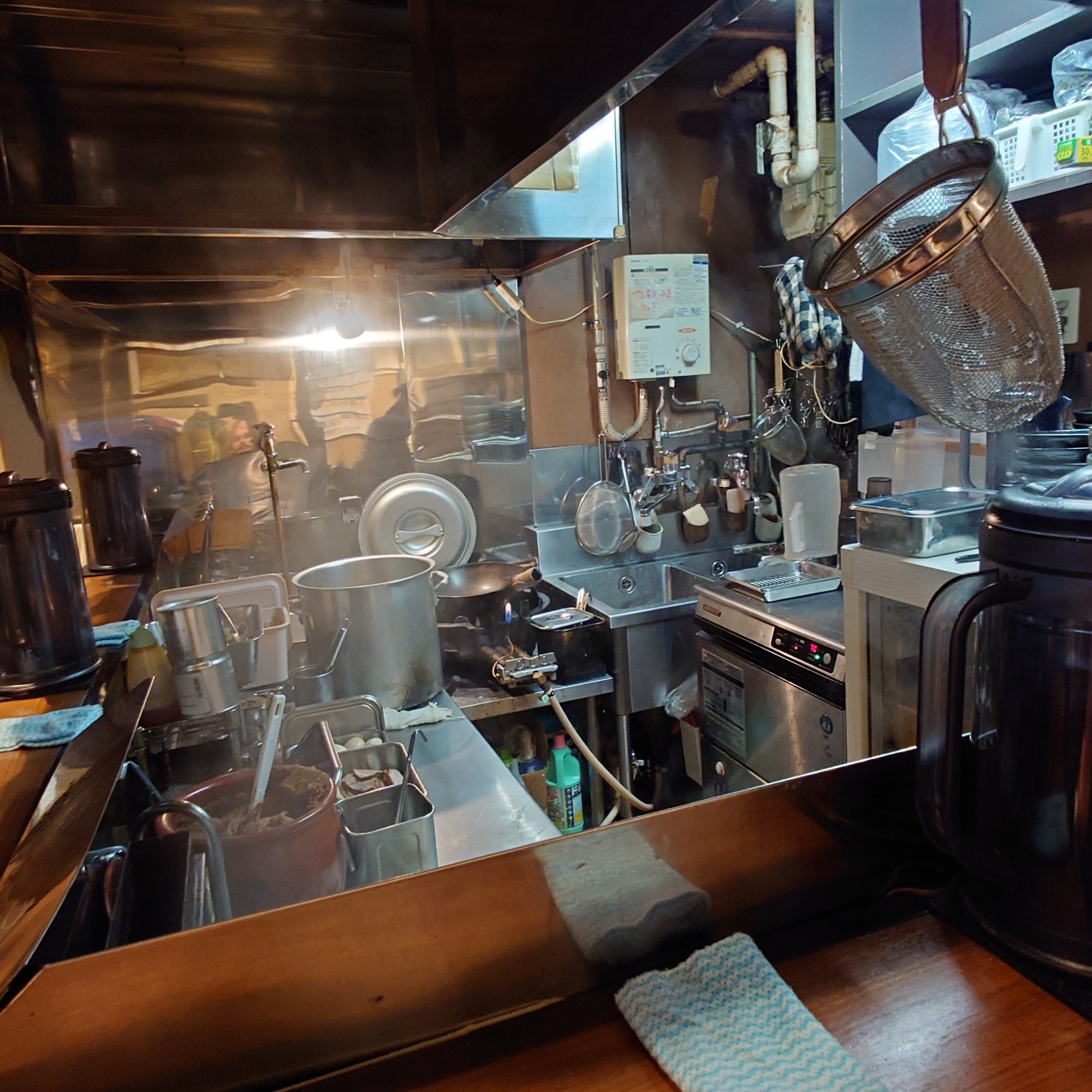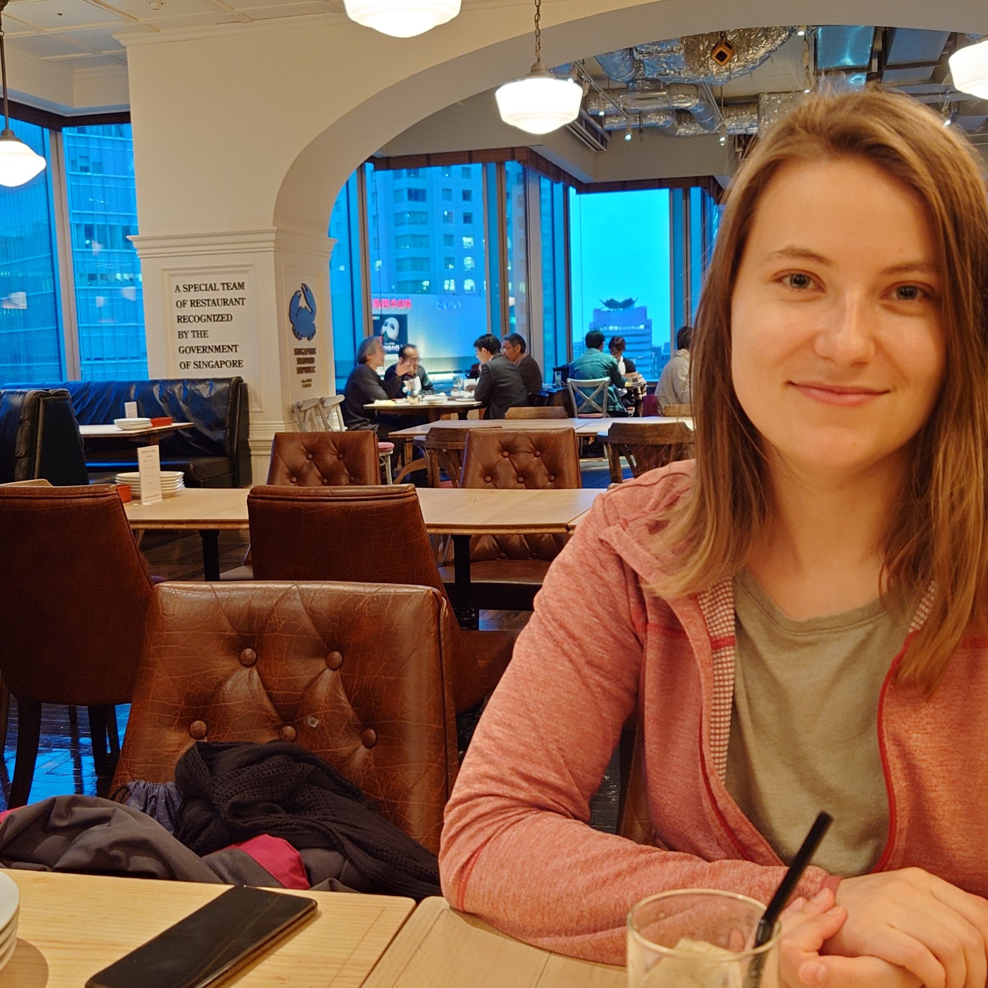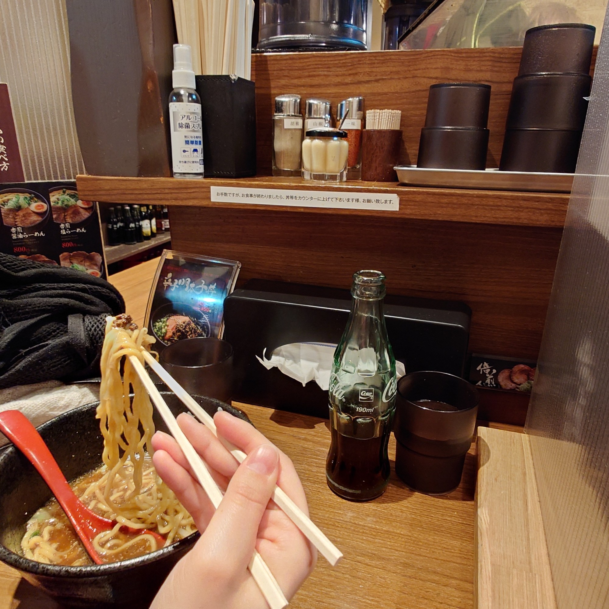 Přijdete k restauraci. Tam je většinou výloha, kde jsou realistický makety jídel, takže během pár vteřin tušíte, co mají v nabídce. Mrknete, jestli je ke vchodu fronta lidí, sedící spořádaně na řadě připravených židlí. Delší fronta značí zájem o podnik. Když spěcháte, volíte něco bez fronty. Když není fronta, nebo jste ji vystáli, vejdete dovnitř a u vchodu zastavíte. Osloví vás obsluha a na prstech vám ukáže dva, vy ukážete taky dva pro potvrzení, že chcete stůl pro dva. Dovedou vás ke konkrétnímu stolu, usadí vás a dají vám vodu a menu. Vybíráte podle obrázků a text proháníte přes Google Translate (přímo přes foťák, stejně byste to neuměli napsat). Na stole vám typicky ještě přistanou skleničky s něčím horkým a hnusným, to je taky k pití. A vlhčený ubrousky, většinou balený – těma si umyjete ruce před jídlem (jakože po rozbalení) a pak je složíte a necháte na stole.