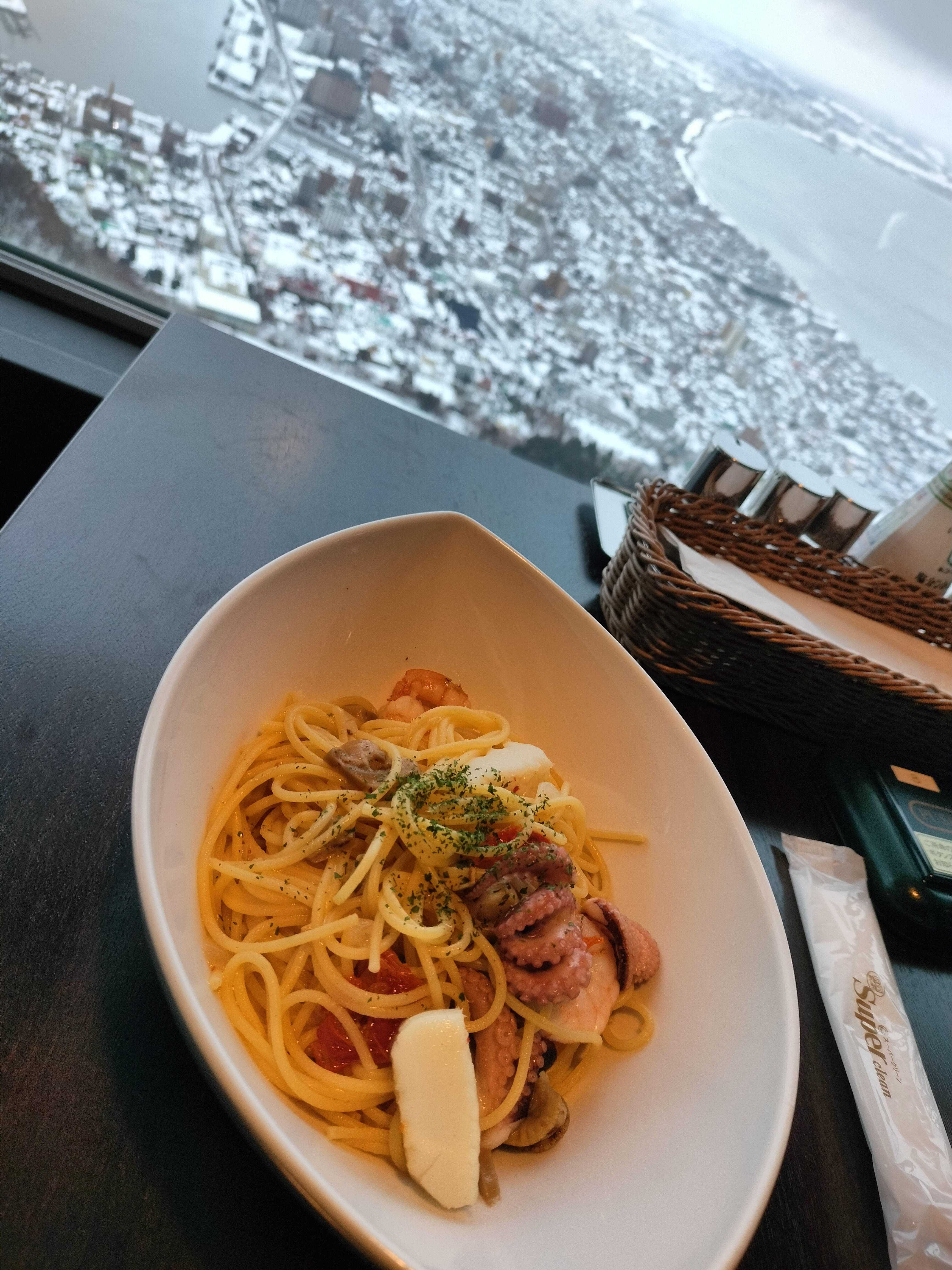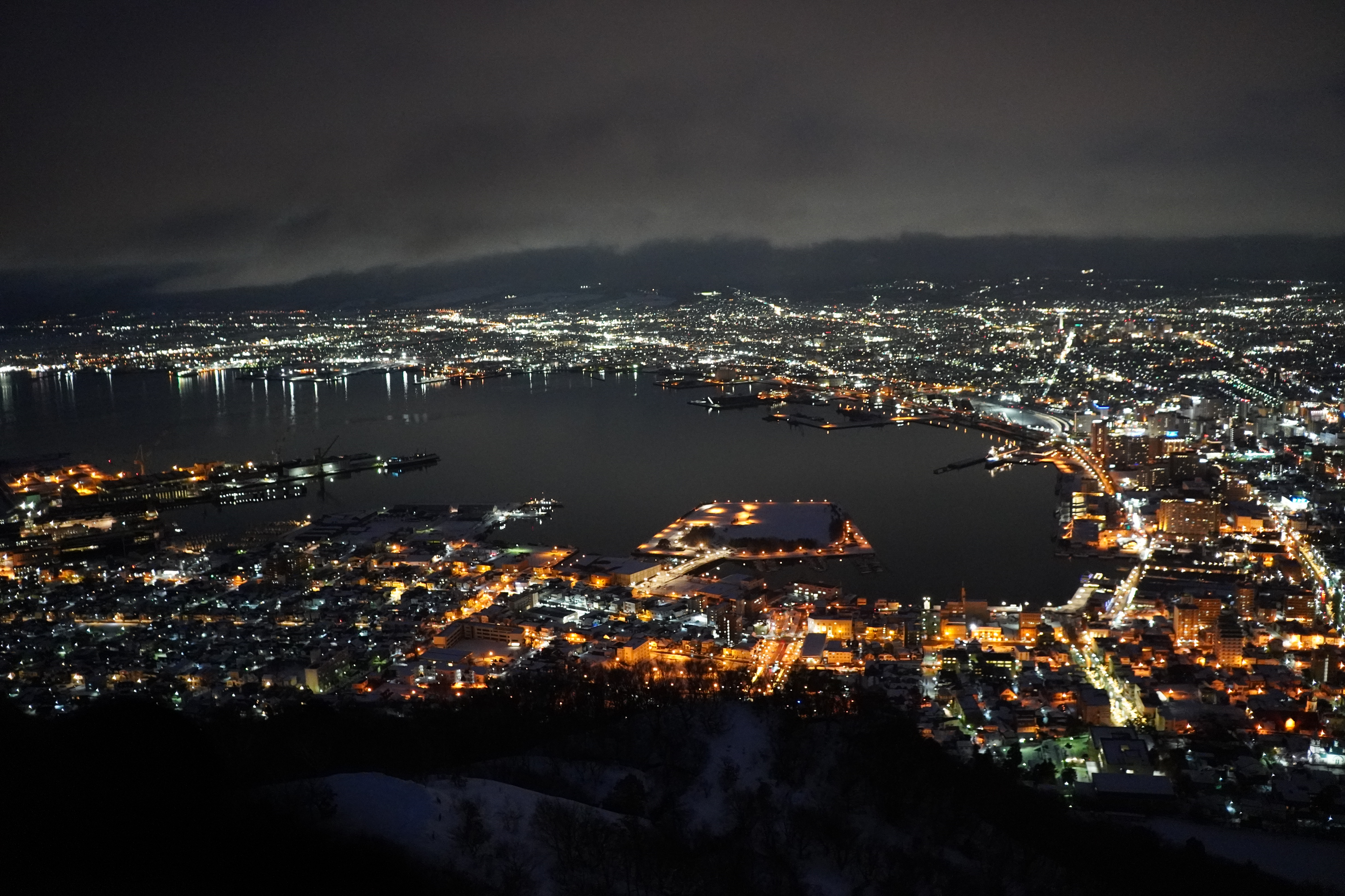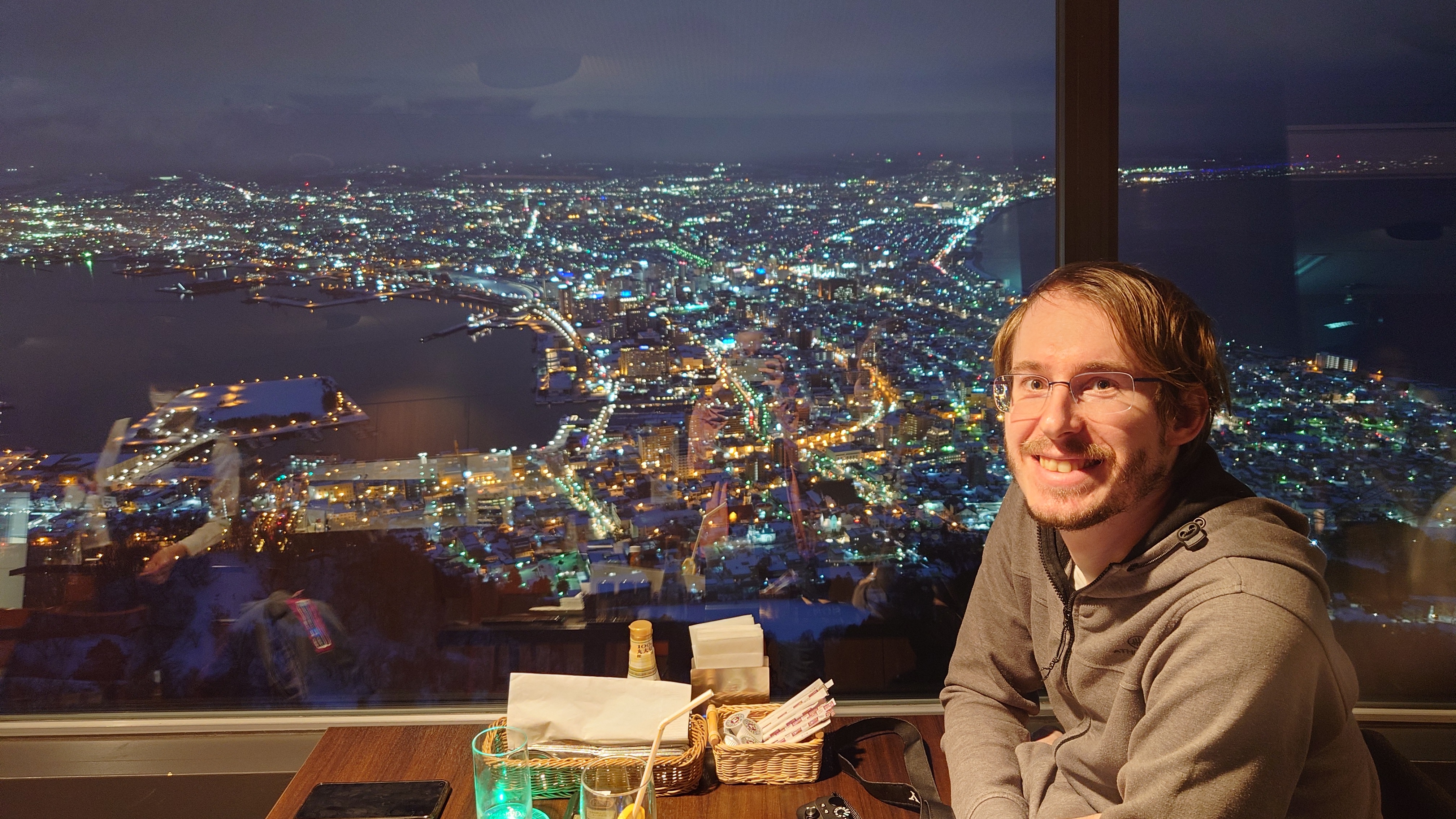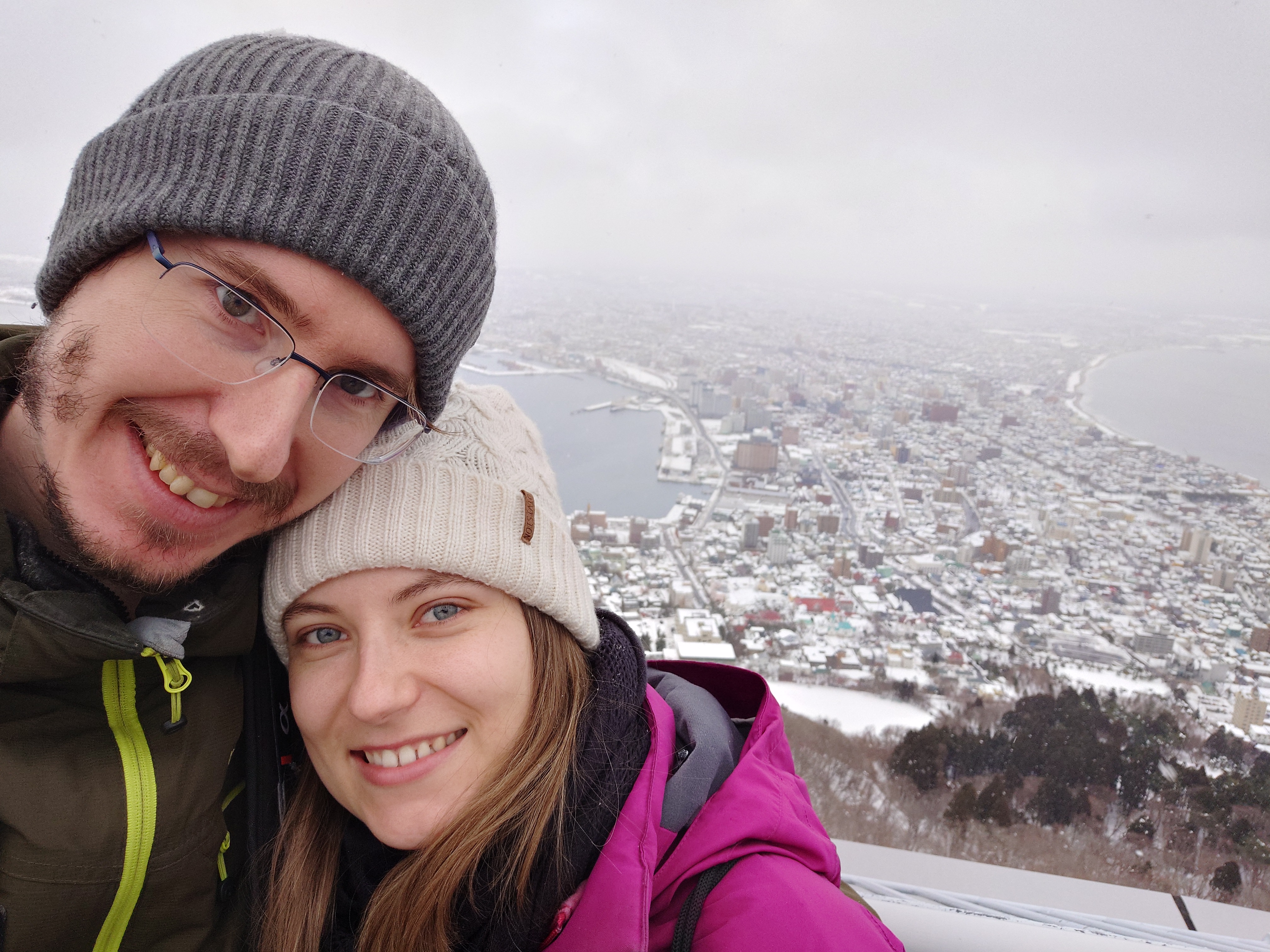 Po snídani jsme vyrazili na Mount Hakodate. Jak název napovídá, tato hora se tyčí přímo ve městě. Na jejím vrcholu se nachází observatoř, vyhlídka a restaurace. Vede tam lanovka, ale my jsme si to chtěli vyšlápnout pěšky. Do západu slunce nám zbývalo ještě pár hodin, takže jsme nemuseli spěchat. Cesta nahoru byla upravená. Někde byly i dřevěné schody, takže se šlo dobře. Na cestu dohlížely malé kamenné sošky Buddhy, které byly rozeseté poblíž. Kolem byla krásná a tichá příroda. Míjeli jsme naprosto neznámé stromy, nad hlavou nám létali cizokrajní ptáci. Celá krajina byla ztichlá. Když jsme se přiblížili k vrcholu, odkryl se nám dechberoucí výhled na moře a začalo sněžit. Nahoru jsme došli zasněžení a zmrzlí. A nadšení. Z vrcholku hory byl nádherný výhled. Nafotili jsme ho ze všech úhlů a stran. Potom jsme si sedli do restaurace, která zrovna otevřela. Byli jsme tam mezi prvními, takže jsme ukořistili místo hned u okna. Během toho, co jsme večeřeli, postupně zapadlo slunce a my jsme měli naprosto exkluzivní výhled na celé město, jak se noří do tmy a rozsvěcí miliony světýlek. Po večeři jsme dolů sjeli lanovkou a prošli se nočním městem zpátky k hostelu.