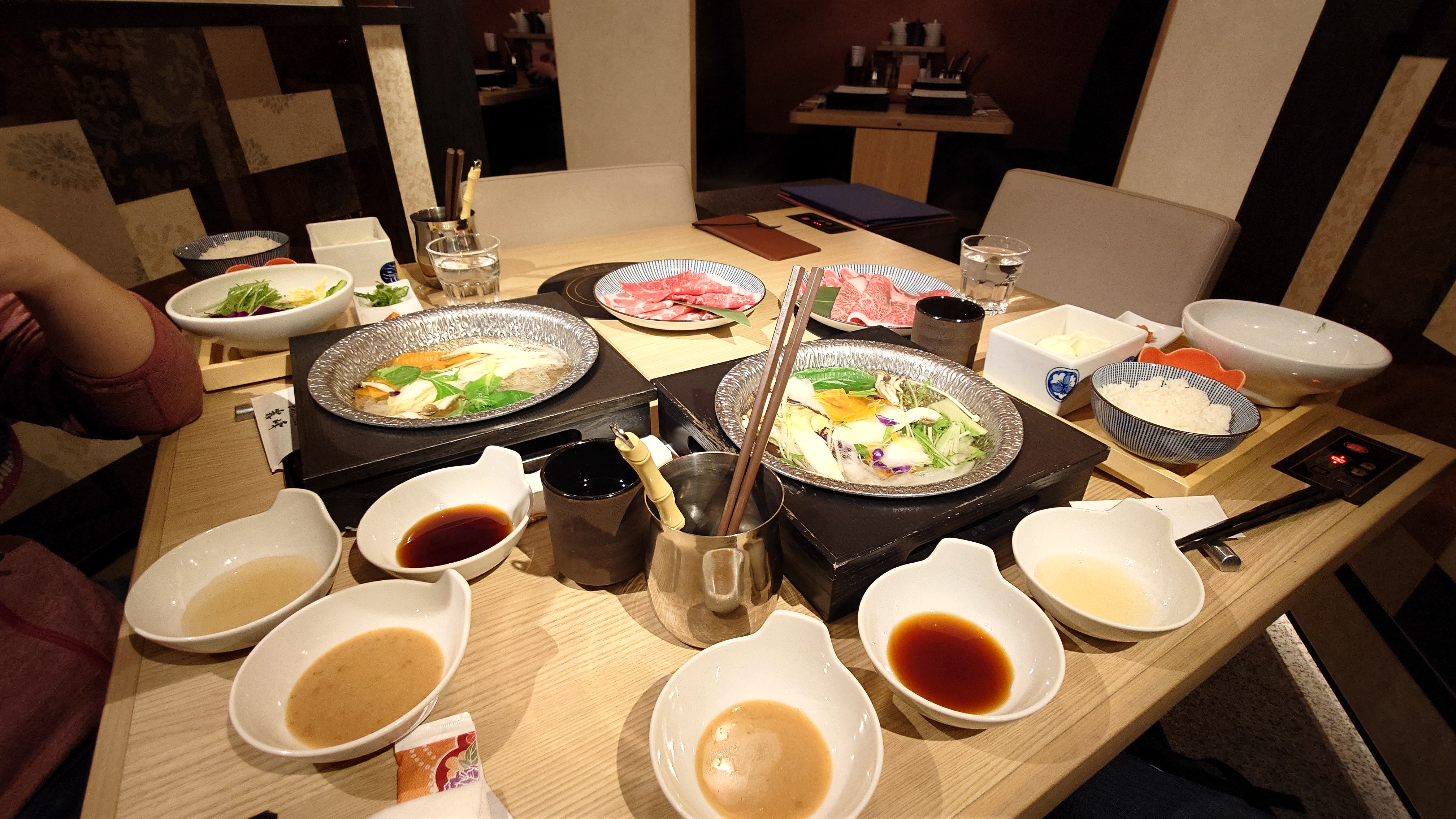 - Shabu-shabu – To si v restauraci vaříte tenký kousky masa a zeleniny ve vývaru, který máte před sebou na stole pěkně na plotýnce, aby nevystydl. Některé to maso bylo to slavné wagyu, jen jsme úplně nezjistili které.