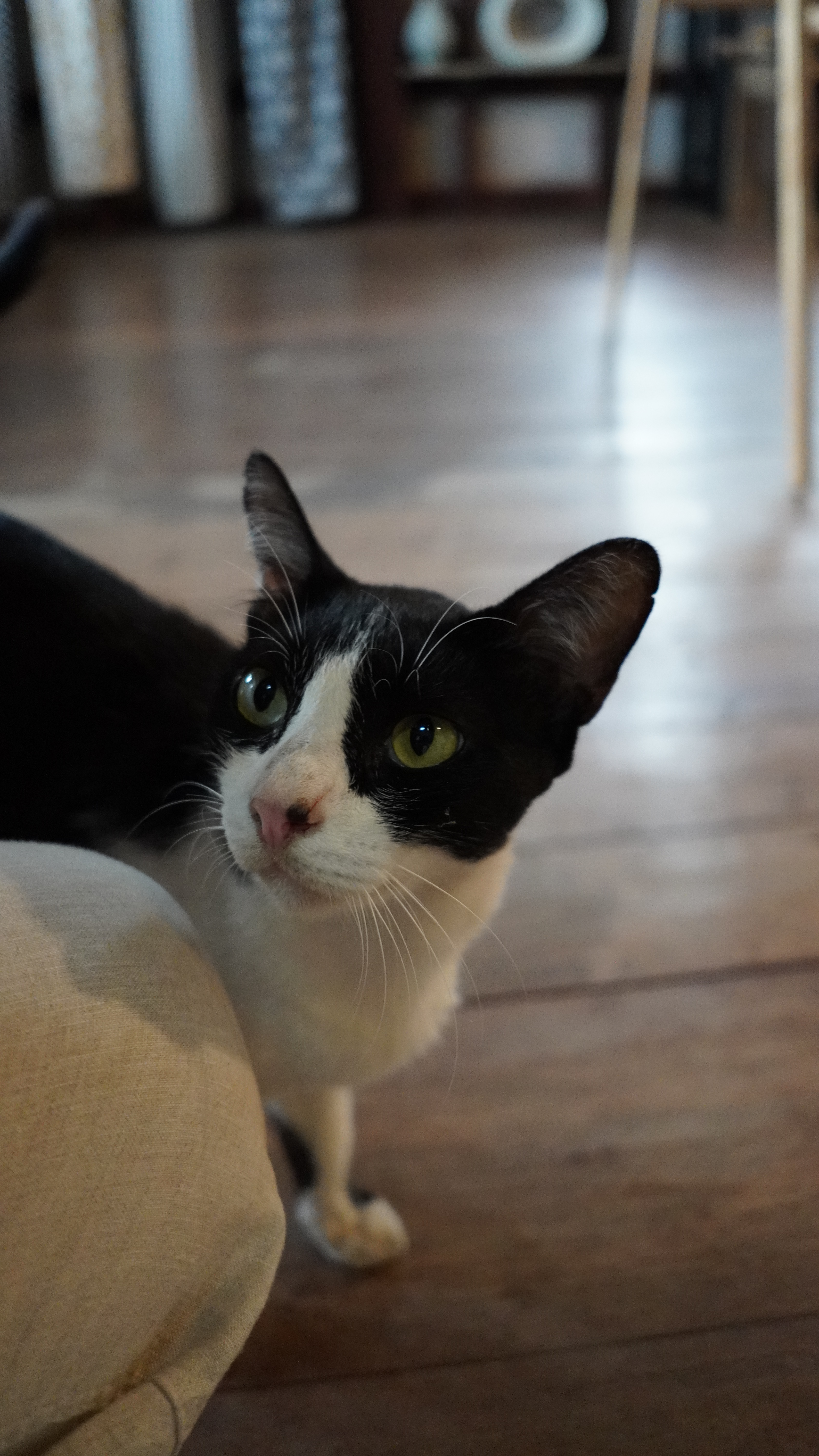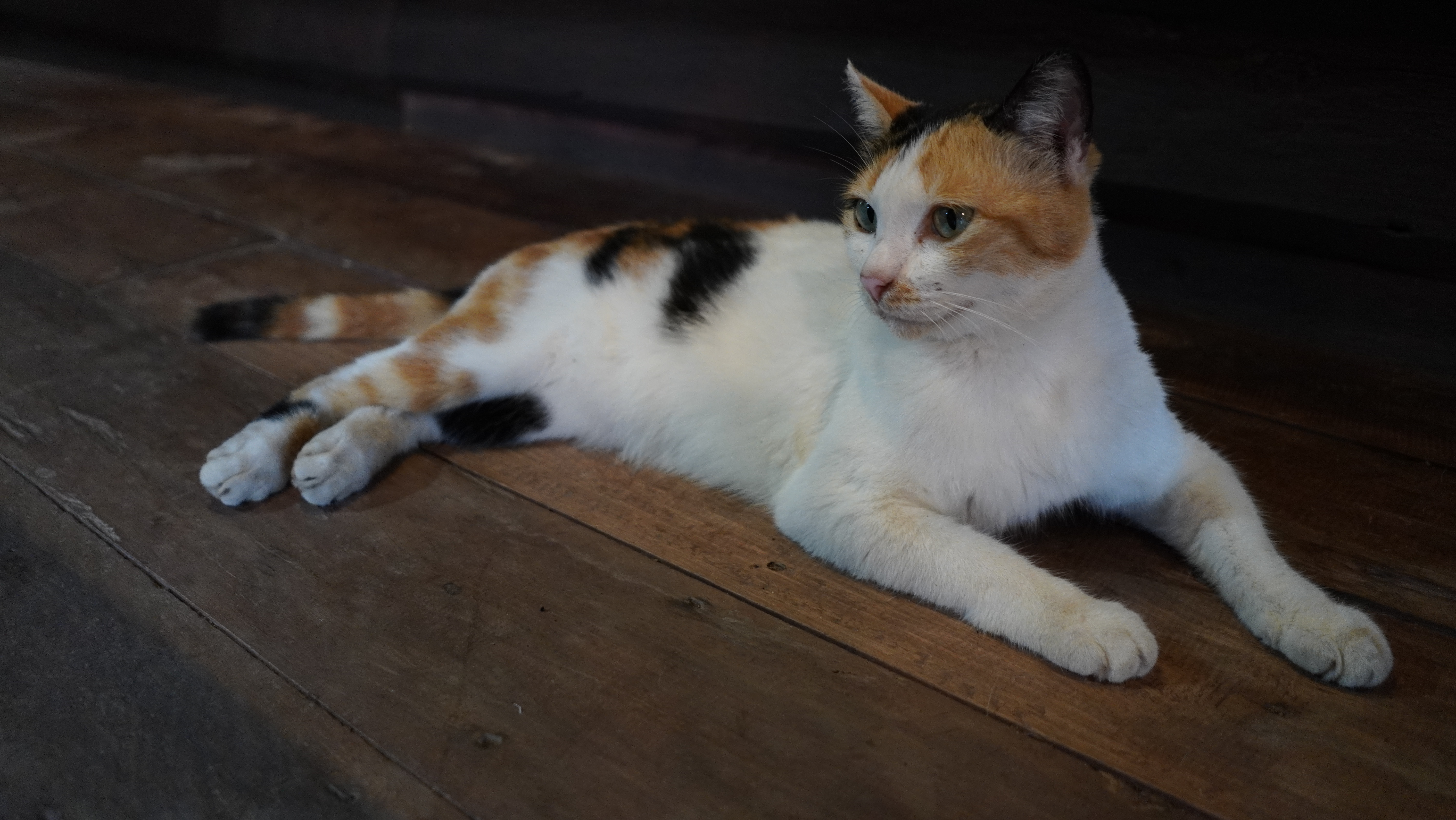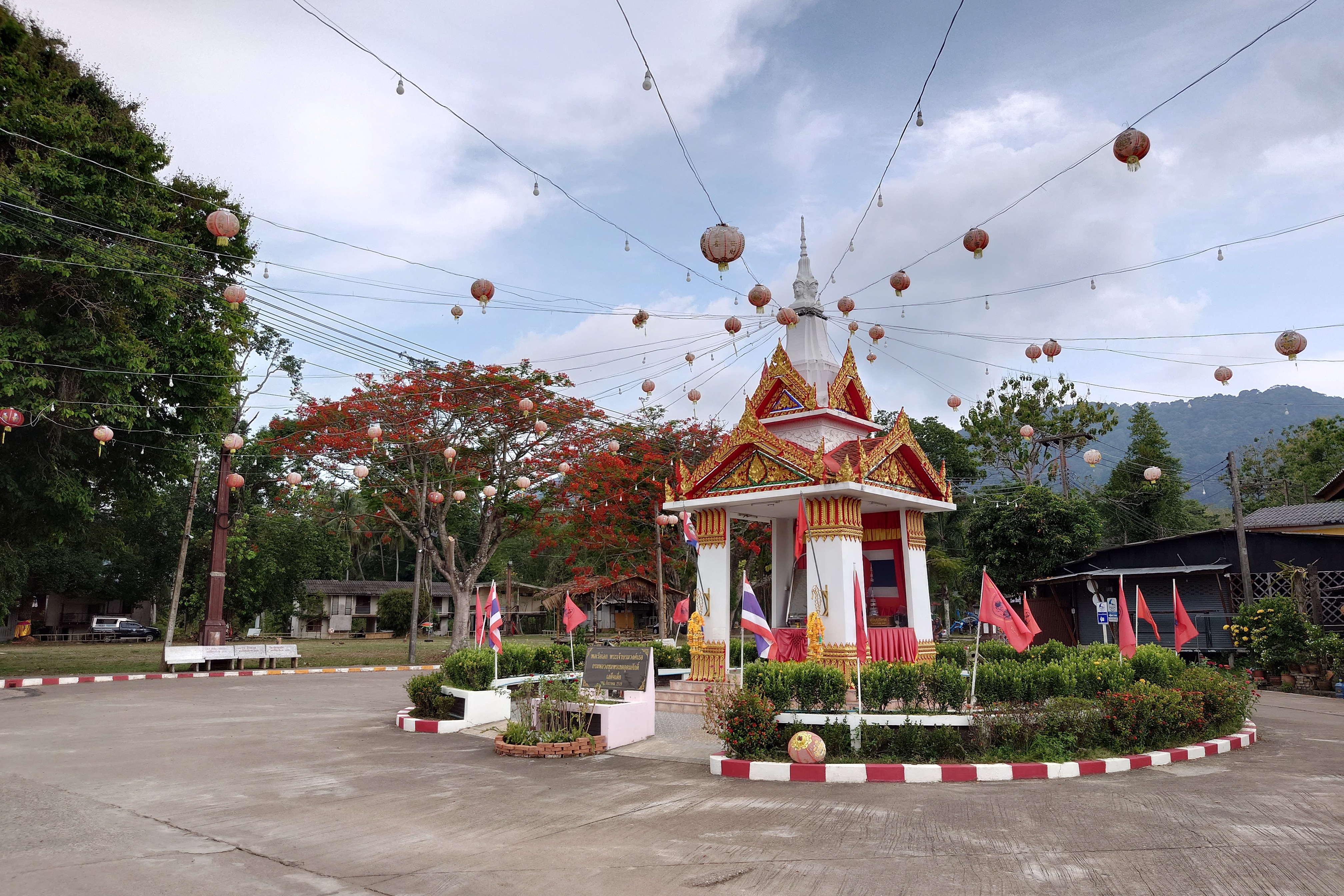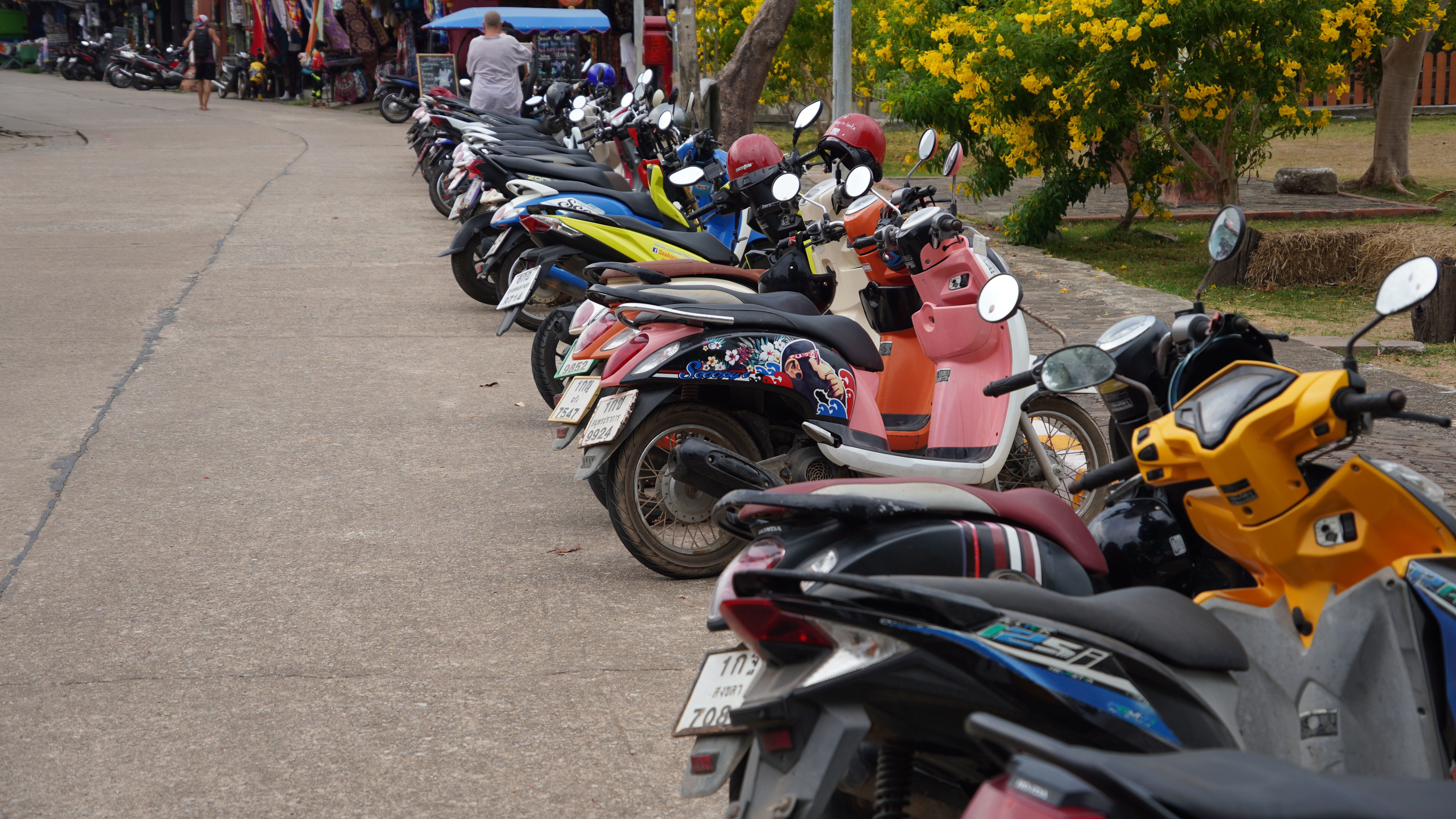 Rozhodli jsme se přesunout se do centra města. Což byla dlouhá ulička lemovaná obchůdky se suvenýry a malými restauracemi a kavárnami. Pomalu jsme ji celou prošli. Občas jsme se v nějakém obchůdku zastavili a podívali se na suvenýry. Někde měli všechny ty stejné, generické zboží, které prodávají ve všech koutech Thajska. Někde ale měli opravdu zajímavé věci. Narazili jsme na obchod s ručně malovanými věcmi. Kameny, hůlky, náušnice, pohledy… Jinde jsme vešli do obchůdku a zjistili, že je to vlastně galerie. Tam jsme dokonce potkali dvě velmi fotogenické kočky. Cestou jsme si vzali do ruky čerstvý kokos, abychom se trochu osvěžili. Později jsme se zastavili na rýži s mangem a kokosovým mlékem. Kolem nás byli hlavně místní, kteří se prostě starali o svoje věci. Občas jsme potkali pár turistů. Celkově to bylo velmi klidné místo. Když jsme došli na konec téhle uličky, vzali jsme to zpátky a stavili se do obchodu pro nějakou pitnou vodu. A to bylo všechno.